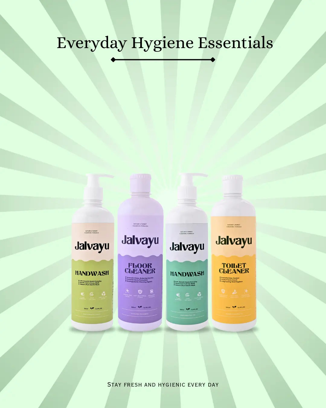 Includes Lemon Handwash, Mint Handwash, Lavender Floor Cleaner & Jasmine Toilet Cleaner