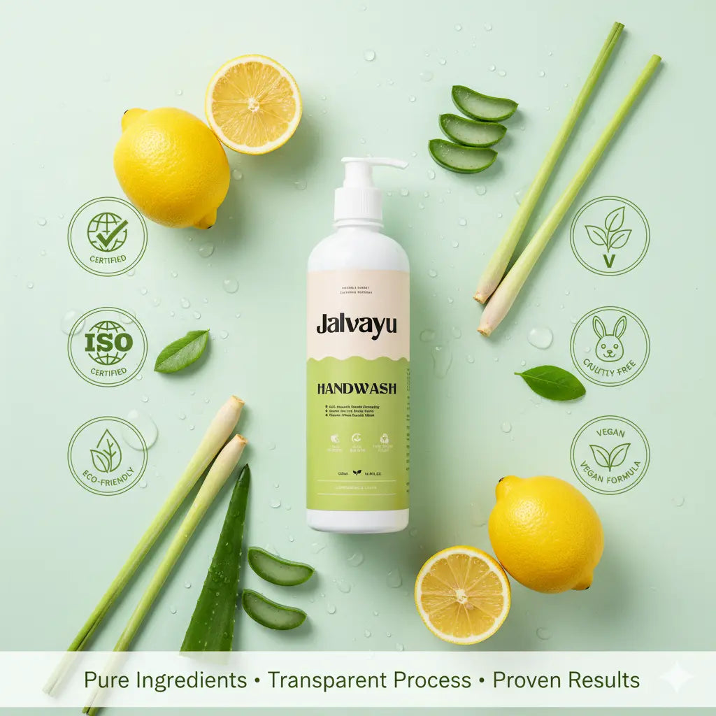 Jalvayu Lemon Handwash is a plant-powered, bio enzyme-based cleanser that removes germs without harsh chemicals. Gentle on skin, refreshing in fragrance, and kind to the planet.