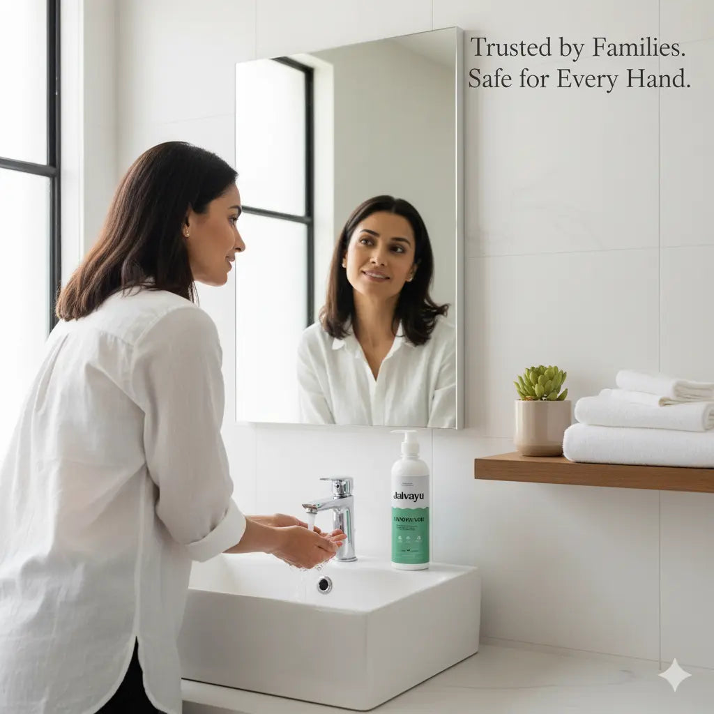 Unlike conventional handwashes that use sulfates and synthetic fragrances, Jalvayu Mint Handwash is completely non-toxic, paraben-free, and cruelty-free — bringing you a product that’s safe for your family, safe for nature.